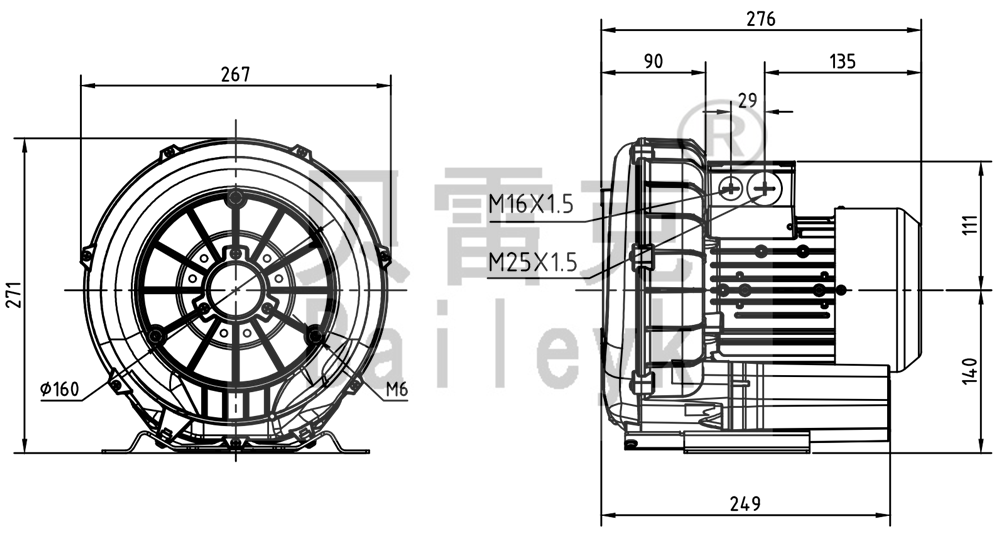 最大風量:140m3/h 最大正壓:100mbar 最大負壓:100mbar 防護等級:IP55 噪音:56db 重量:13Kg |