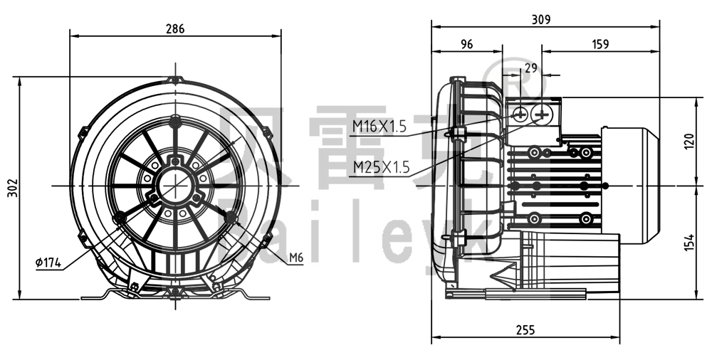 最大風量:180m3/h 最大正壓:100mbar 最大負壓:110mbar 防護等級:IP55 噪音:64db 重量:17Kg |