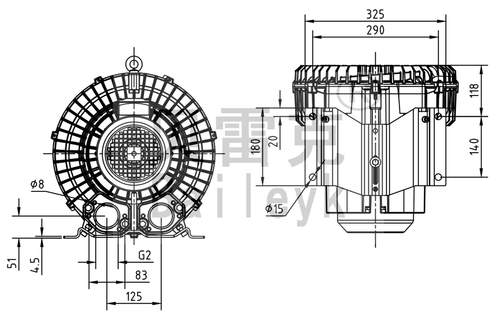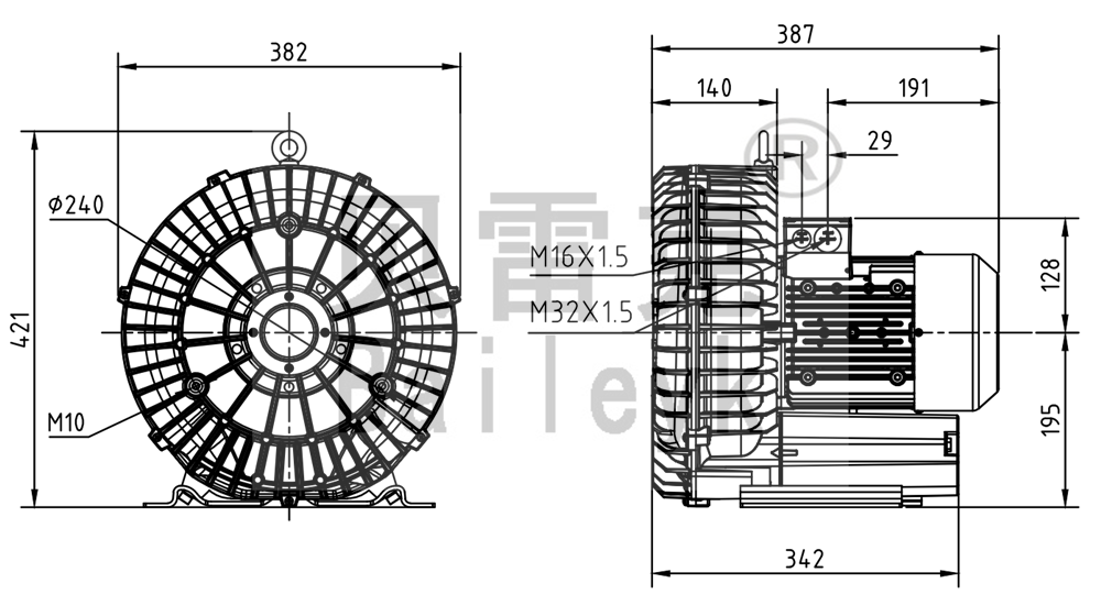 最大風量:420m3/h 最大正壓:170mbar 最大負壓:180mbar 防護等級:IP55 噪音:70db 重量:32Kg |