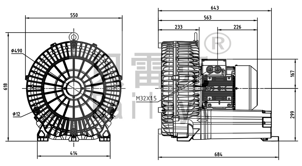 最大風量:1370m3/h 最大正壓:110mbar 最大負壓:120mbar 防護等級:IP55 噪音:75db 重量:98Kg |